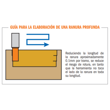 Guía para la elaboración de una ranura profunda: Reduciendo la longitud de la ranura aproximadamente 0.1mm por tramo, se reduce el riesgo de rotura, en tanto que la herramienta no toca el lado de la ranura en toda su longitud.