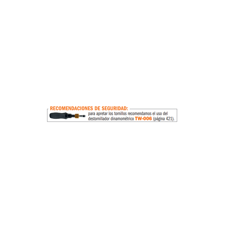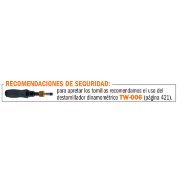 Recomendaciones de seguridad: para apretar los tornillos recomendamos el uso del destornillador dinamométrico TW-006